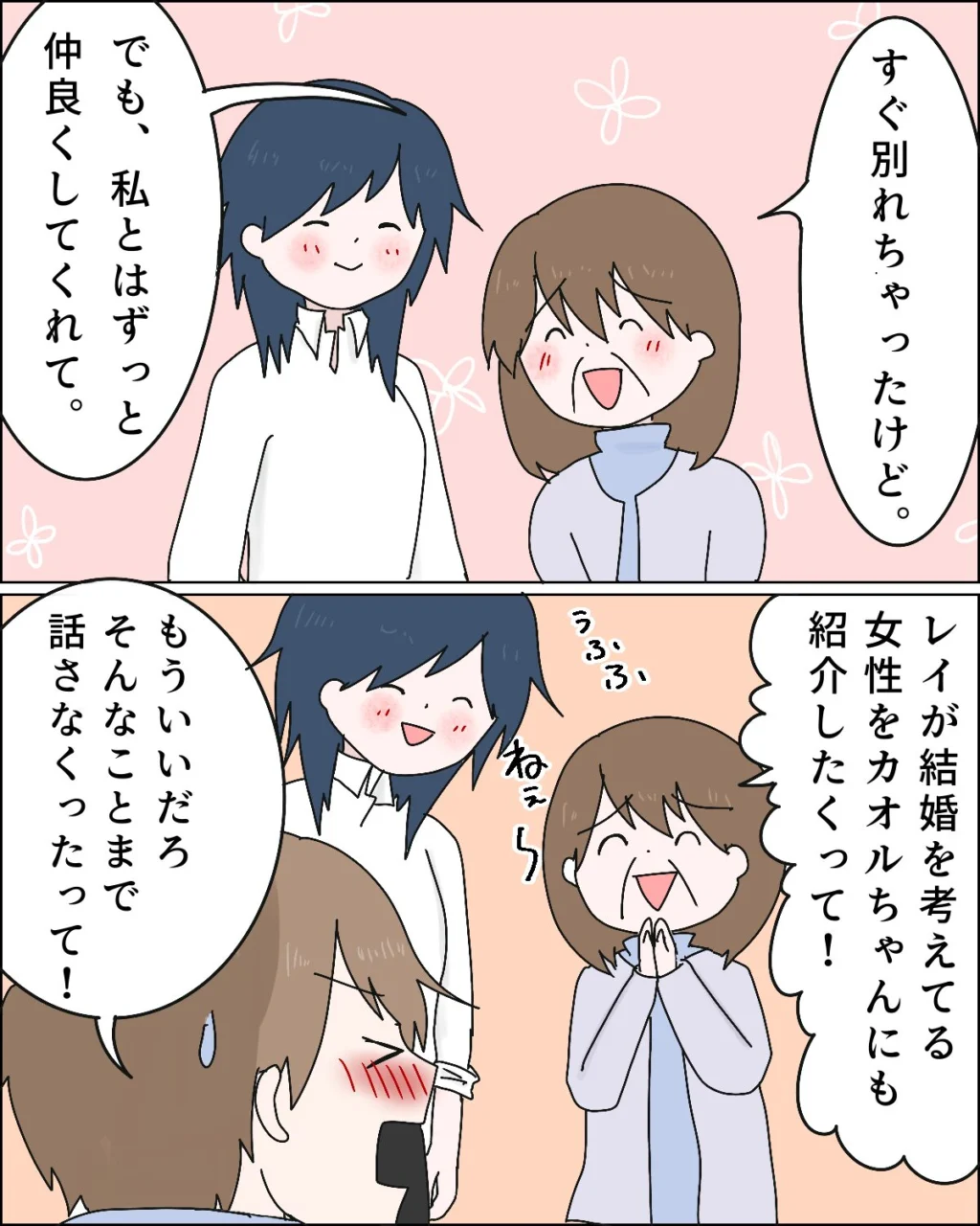 唖然とする私のことなどお構いなしに、レイのお母さんは「すぐ別れちゃったけど。でも、私とはずっと仲良くしてくれて。レイが結婚を考えてる女性をカオルちゃんにも紹介したくって!」と私に説明しながらカオルさんとの再会が嬉しくてたまらない様子。そして、私の隣では「もういいだろ。そんなことまで話さなくたって!」と頬を赤らめながら恥ずかしそうにするレイ。
