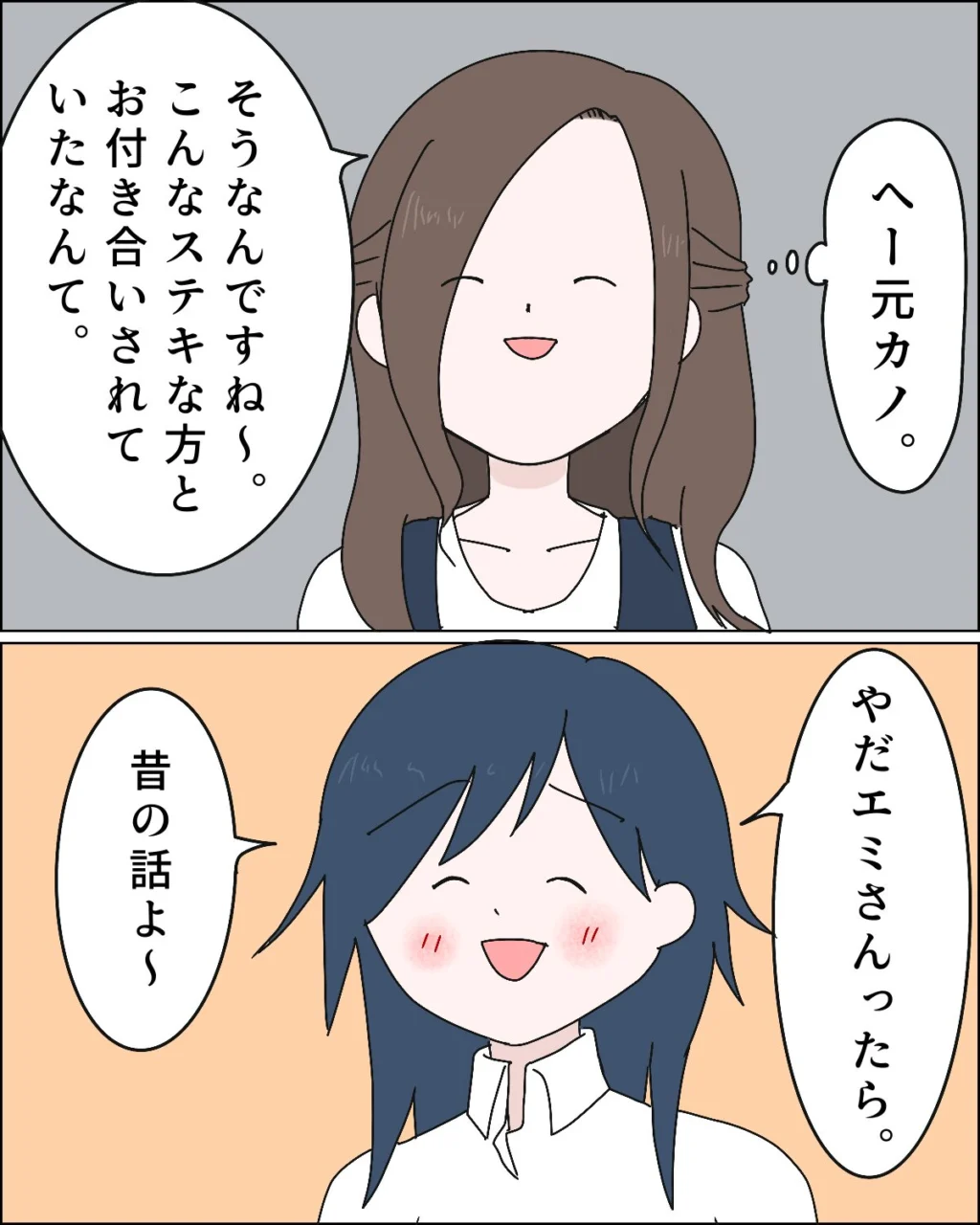 私は「へー元カノ」と思いながら、「そうなんですね~。こんなステキな方とお付き合いされていたなんて」と笑顔で答えると、「やだエミさんったら。昔の話よ~」と照れ臭そうに笑うカオルさん。