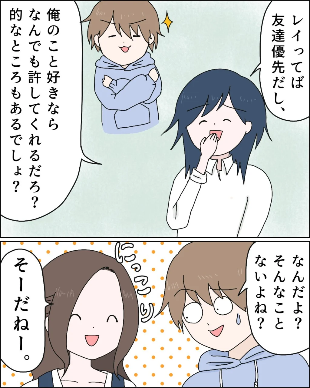 「レイってば友達優先だし、俺のこと好きならなんでも許してくれるだろ?的なところもあるでしょ?」とカオルさんが笑いながら言うと、レイが「なんだよ?そんなことないよね?」と私に聞いてきたので、私は満面の笑みで「そーだねー」と棒読みのセリフを返しました。