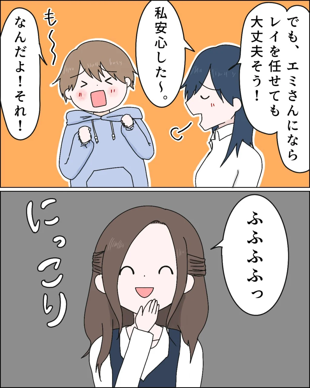 カオルさんは「でも、エミさんにならレイを任せても大丈夫そう!私安心した~」と安堵の表情を浮かべ、「も~なんだよ!それ!」と不貞腐れるレイ。私は何を見せられているのでしょうか?私は「ふふふふっ」とただただ笑って2人のやり取りを見ていました。