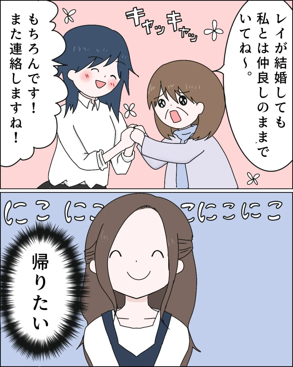 すると、今度はレイのお母さんが「レイが結婚しても私とは仲良しのままでいてね~」と目を潤ませながらカオルさんの手を握り、「もちろんです!また連絡しますね!」と応えるカオルさん。えーっと・・私、どうしてここにいるんだろう?レイの彼女として挨拶に来たけど、私、むしろお邪魔じゃない?レイとお母さんとカオルさんの3人にしかわからない空気感・・。私は「帰りたい」と心底思いました。