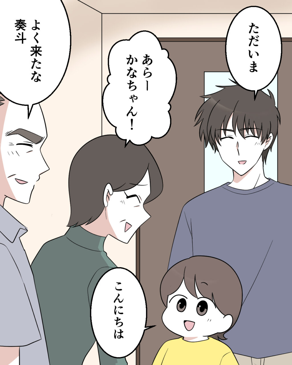 凪子と離婚後、俺は実家に戻って暮らしています。凪子から奏斗を預かった俺は、ファミレスでご飯を食べた後、いつものように奏斗を家に連れて行きました。家に入ると、待ち構えていた両親が「あらーかなちゃん!」「よく来たな、奏斗」と笑顔で出迎えます。奏斗も「こんにちは」と笑顔で挨拶。