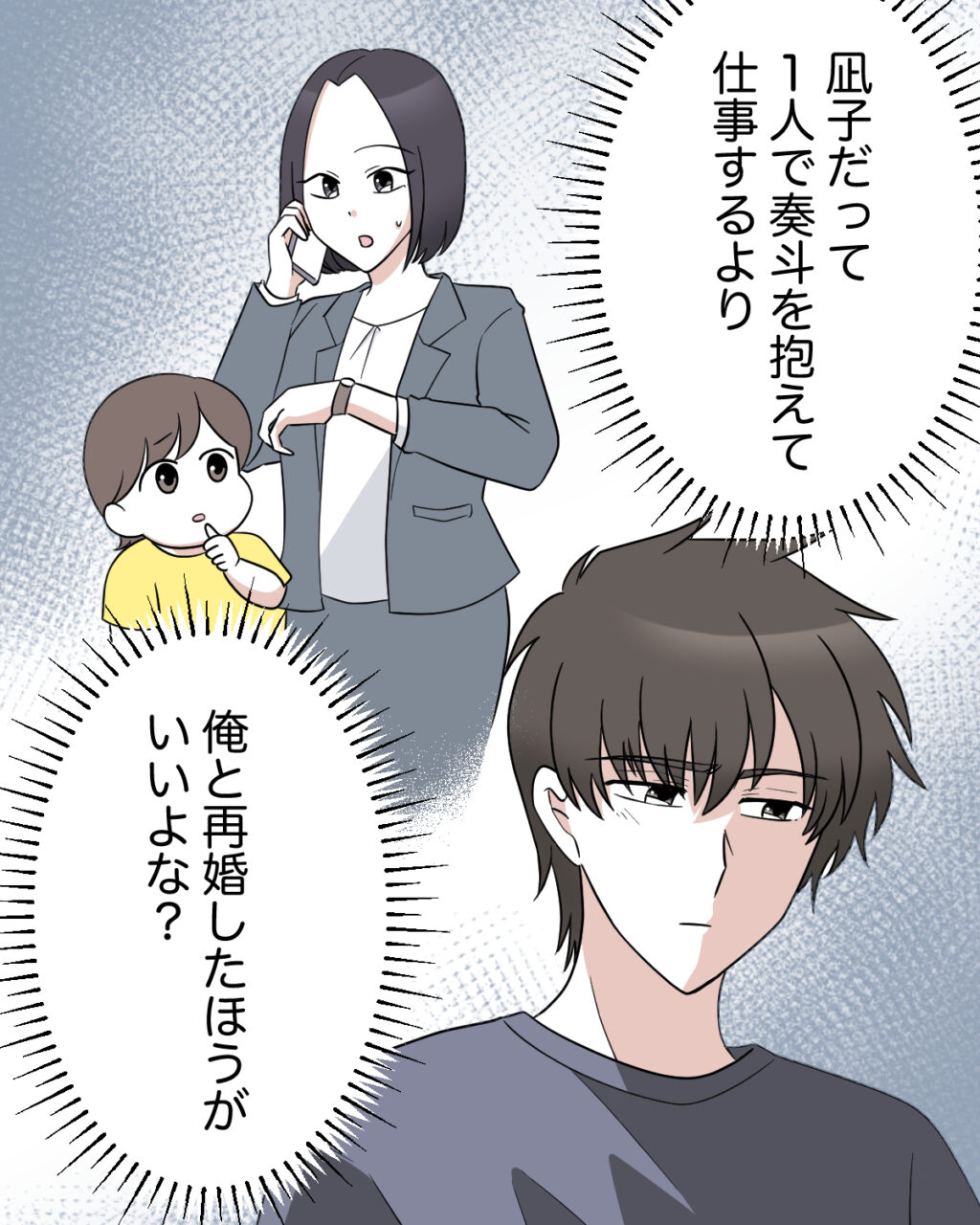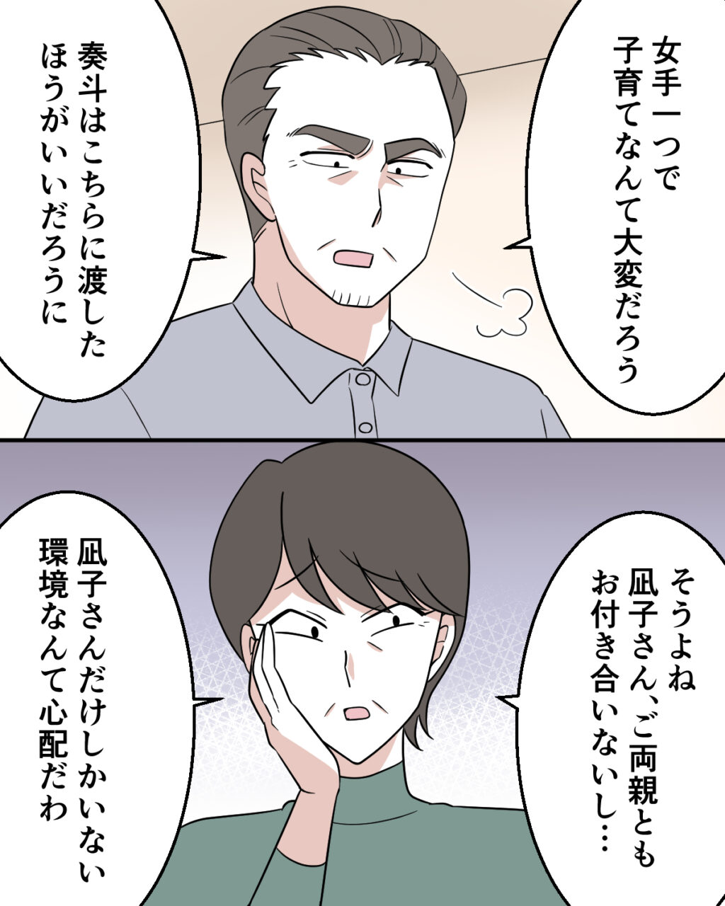 すると、父さんが「女手一つで子育てなんて大変だろう。奏斗はこちらに渡したほうがいいだろうに」とため息まじりで言い、母さんも「そうよね。凪子さん、ご両親ともお付き合いないし・・。凪子さんだけしかいない環境なんて心配だわ」と言い出しました。実家と折り合いが悪かった凪子は、離婚後も実家には頼らず、仕事をしながら一人で奏斗を育てているのです。