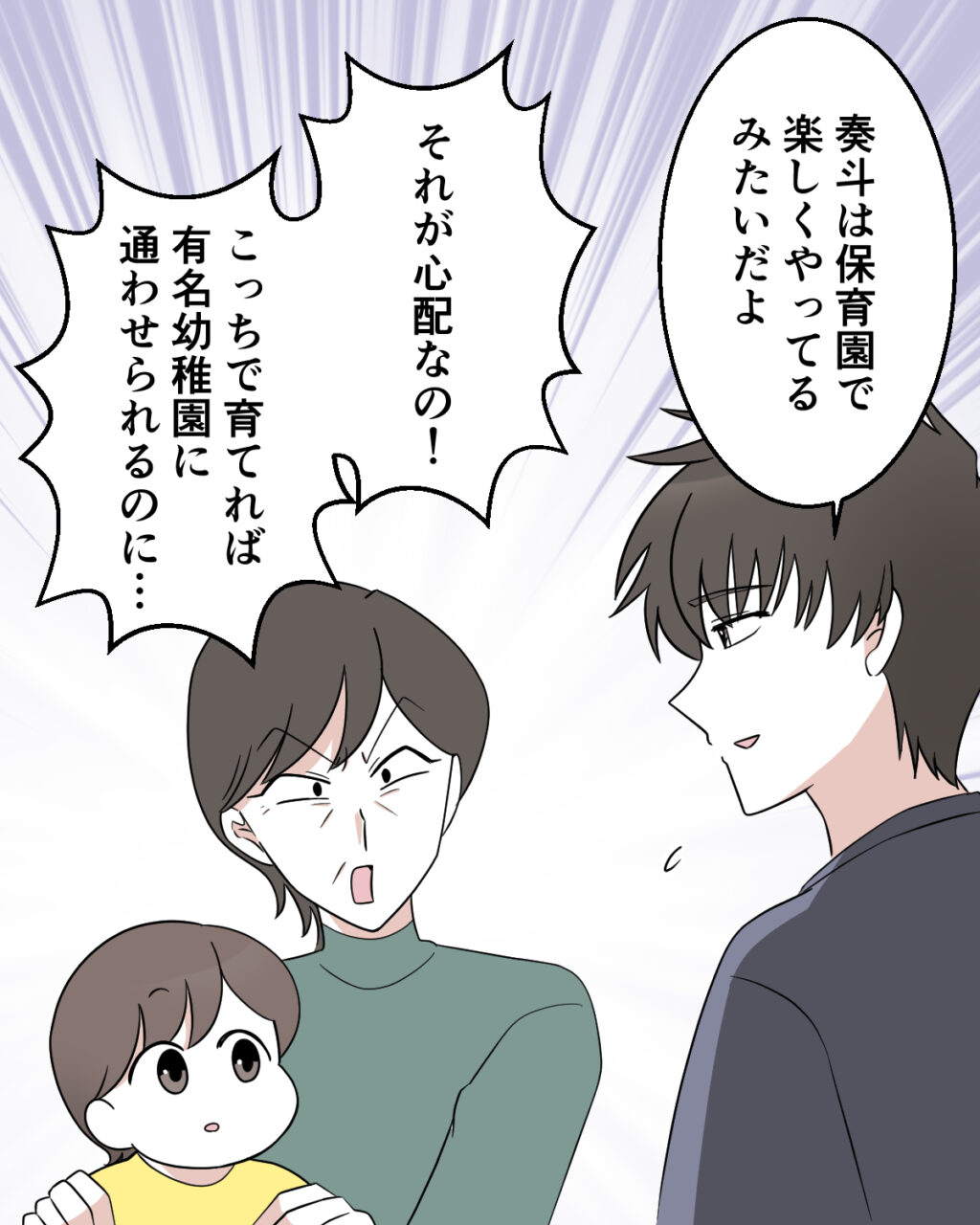 「奏斗は保育園で楽しくやってるみたいだよ」と伝えるも、「それが心配なの!こっちで育てれば有名幼稚園に通わせられるのに・・」と納得いかない様子の母さん。