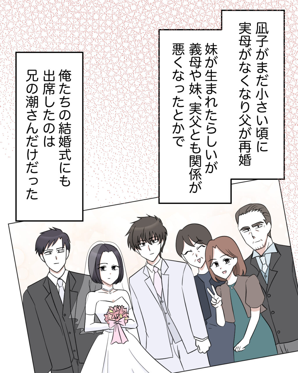 凪子の家庭は、凪子がまだ小さい頃に実母が亡くなり父親が再婚。その後、妹が生まれたらしいのですが、継母や妹、実父とも関係が悪くなったようで、俺たちの結婚式にも出席したのは兄の潮さんだけでした。