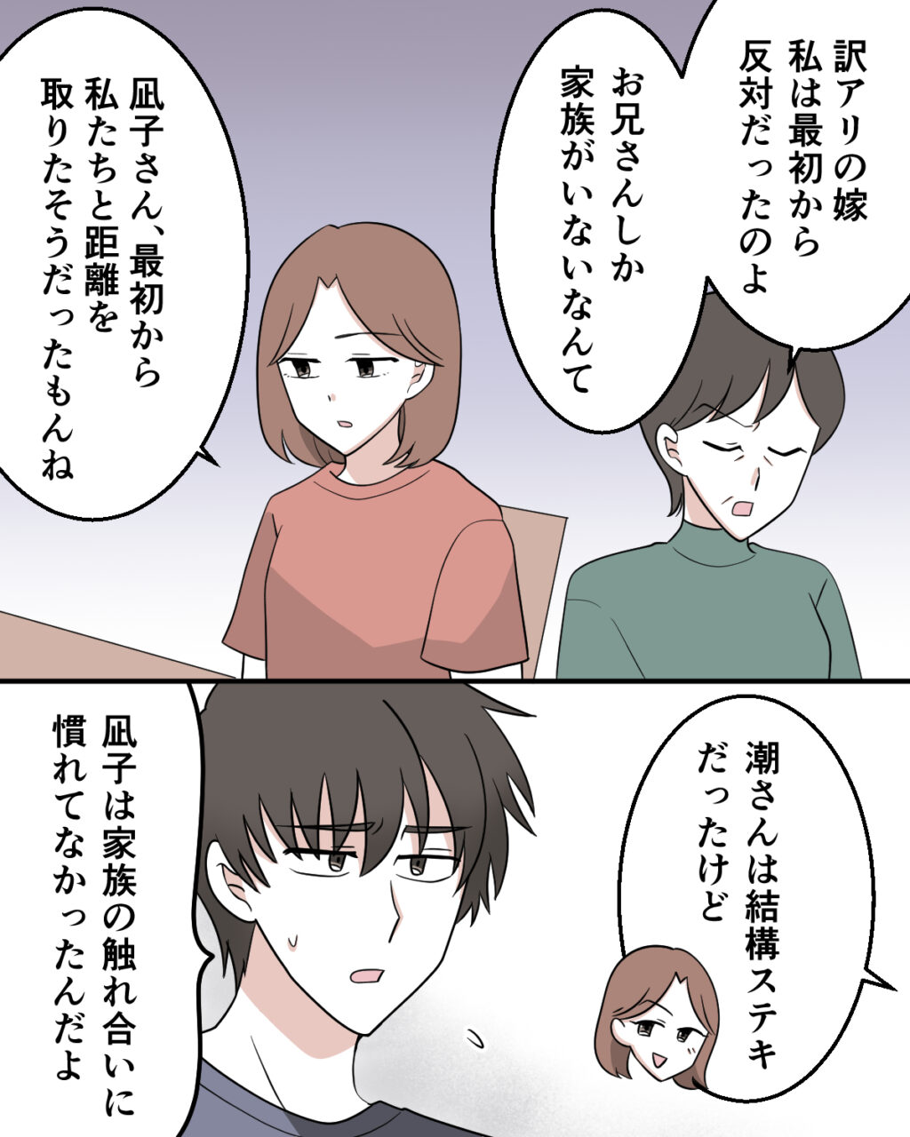 母さんと祐子は「訳アリの嫁、私は最初から反対だったのよ。お兄さんしか家族がいないなんて」「凪子さん、最初から私たちと距離を取りたそうだったもんね。潮さんは結構ステキだったけど」とやはり凪子が気に入らない様子。俺は「凪子は家族の触れ合いに慣れてなかったんだよ」と弁明しましたが、
