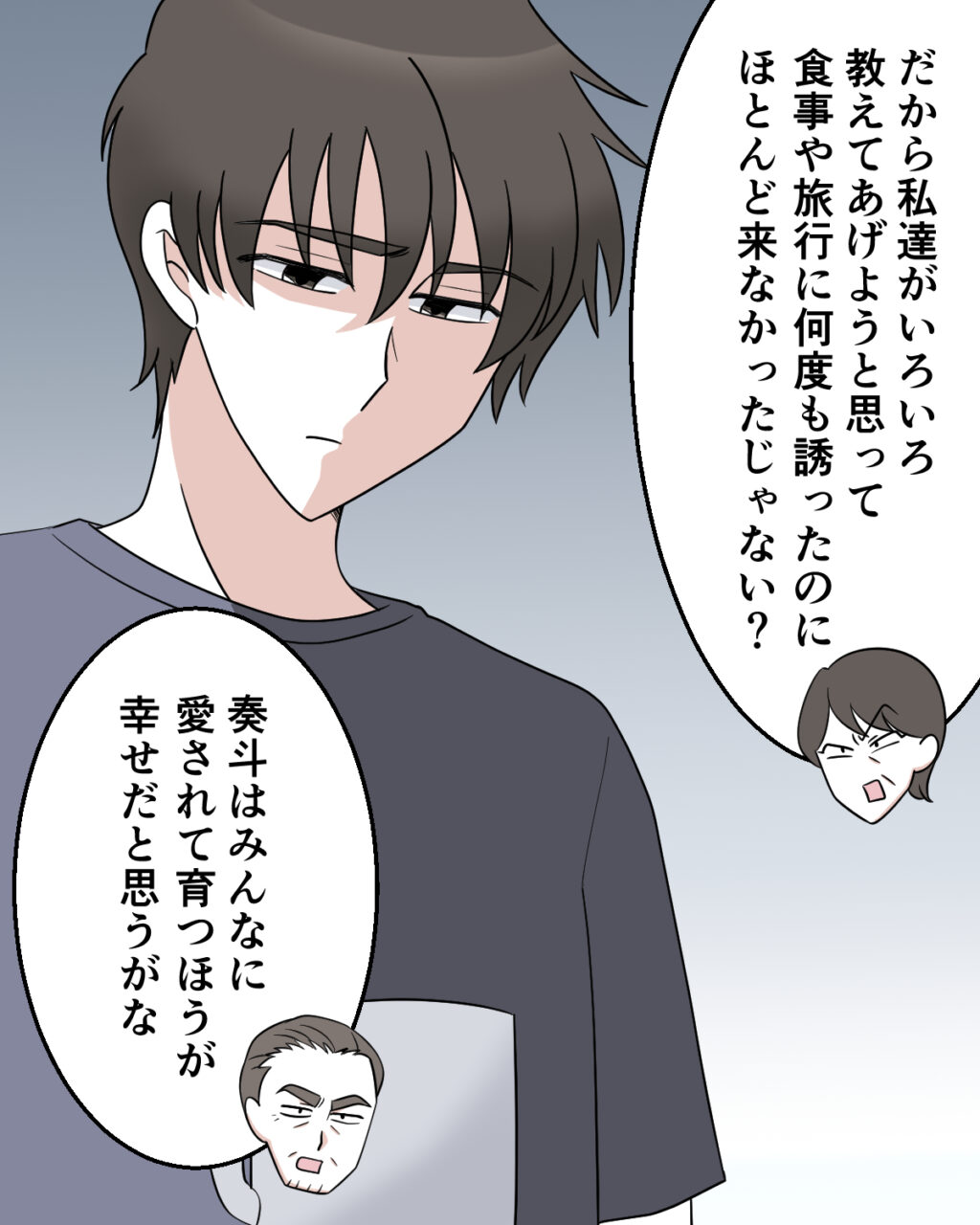 「だから私達がいろいろ教えてあげようと思って食事や旅行に何度も誘ったのにほとんど来なかったじゃない?」と腹立たしそうに母さんが言い、父さんも「奏斗はみんなに愛されて育つ方が幸せだと思うがな」とぼやきました。