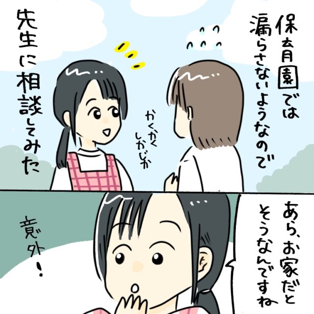 保育園では漏らさないようなので、先生に相談してみた。先生は「あら、お家だとそうなんですね。意外!」と驚いていました。