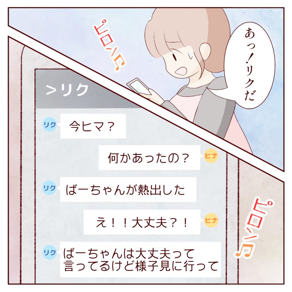 スマホを見つめていると1件の通知が届きました。「あっ!リクだ」急いでメッセージを開くと、どうやら義祖母が熱を出したそう。「大丈夫!?」と聞くと、「ばーちゃんは大丈夫って言ってるけど様子見に行って」と返信がありました。