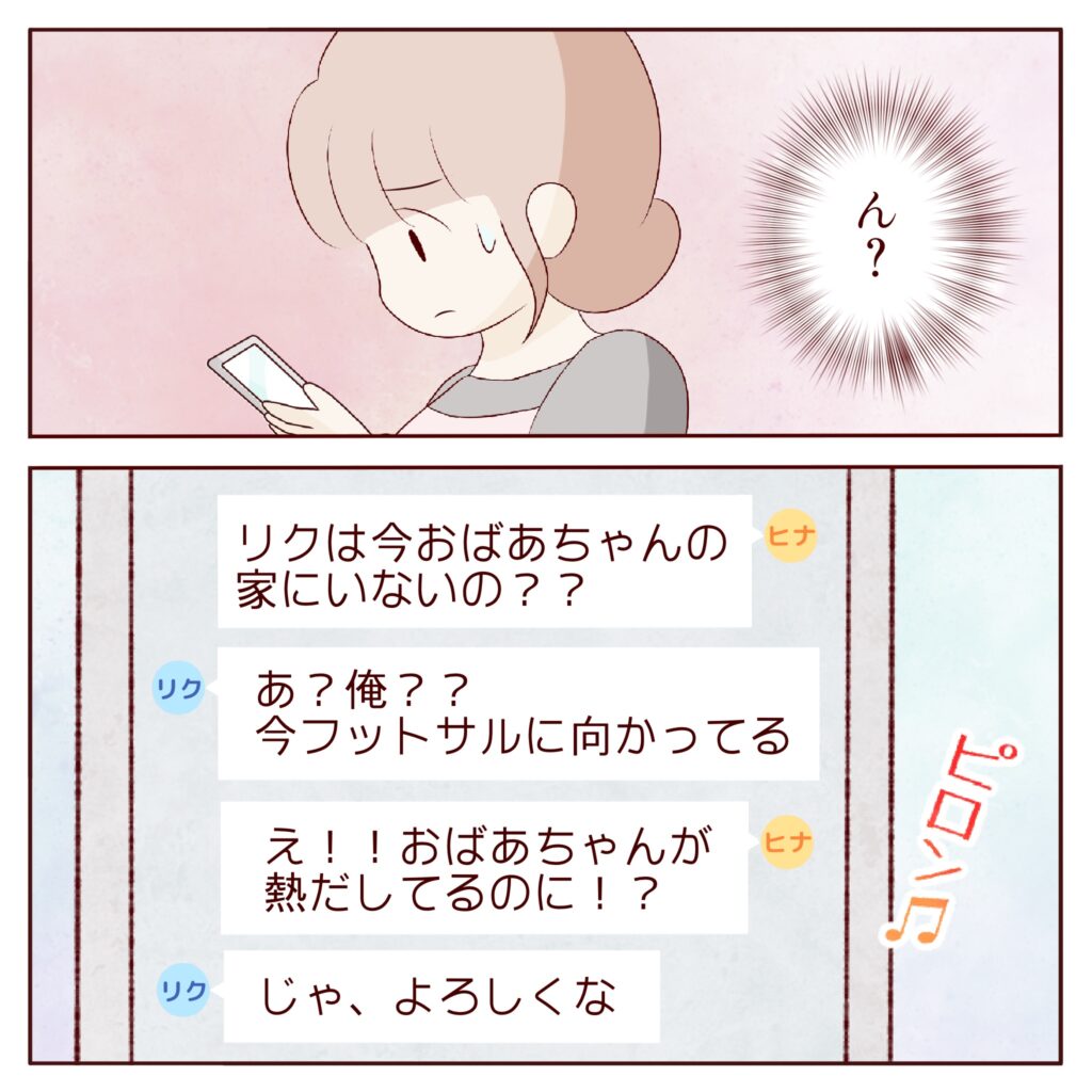 「・・・ん?様子を見に行って?」ヒナさんの頭に疑問符が浮かびました。嫌な予感がしたヒナさんは、リクさんに 「リクはいま、おばあちゃんの家にいないの?」と聞きます。すると「俺?今フットサルに向かってる」と驚きの返信が!