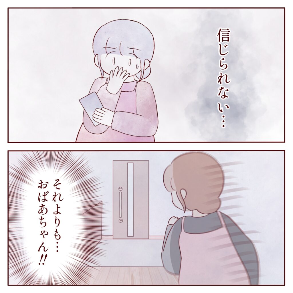 義祖母の家に着いたヒナさんは、急いで寝室に向かい「おばあちゃん!大丈夫ですか!」と声をかけます。義祖母は熱で意識もうろうとしているのか、弱弱しい声で「ヒナちゃんは妊婦さんだから入っちゃダメよ・・・」と言いました。