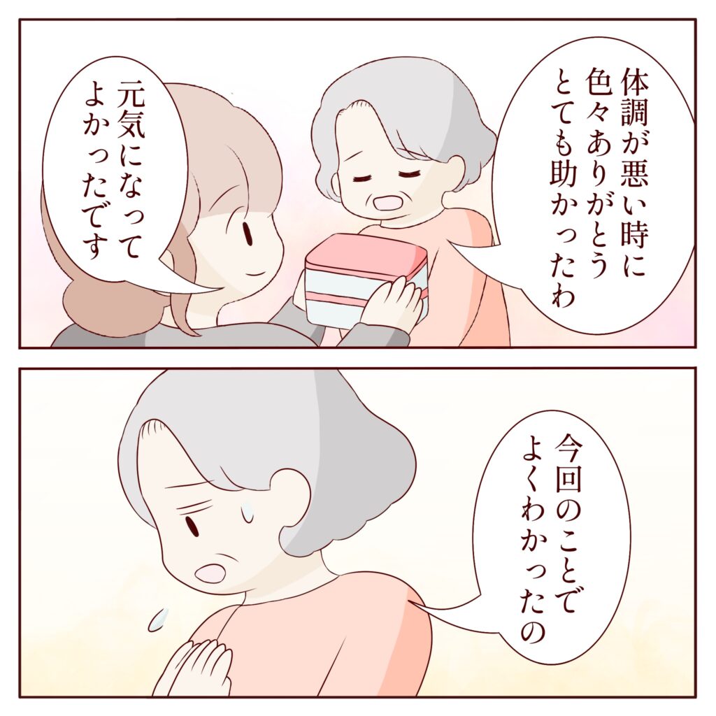 後日、ヒナさんが義祖母の家にご飯の容器を取りに行くと、「体調が悪い時に色々ありがとう、とても助かったわ」と申し訳なさそうに頭を下げられました。ヒナさんはいつも通りの笑顔で「元気になってよかったです」と返します。すると義祖母は、少し言いにくそうに「今回のことでよくわかったの・・・」と語り始めました。