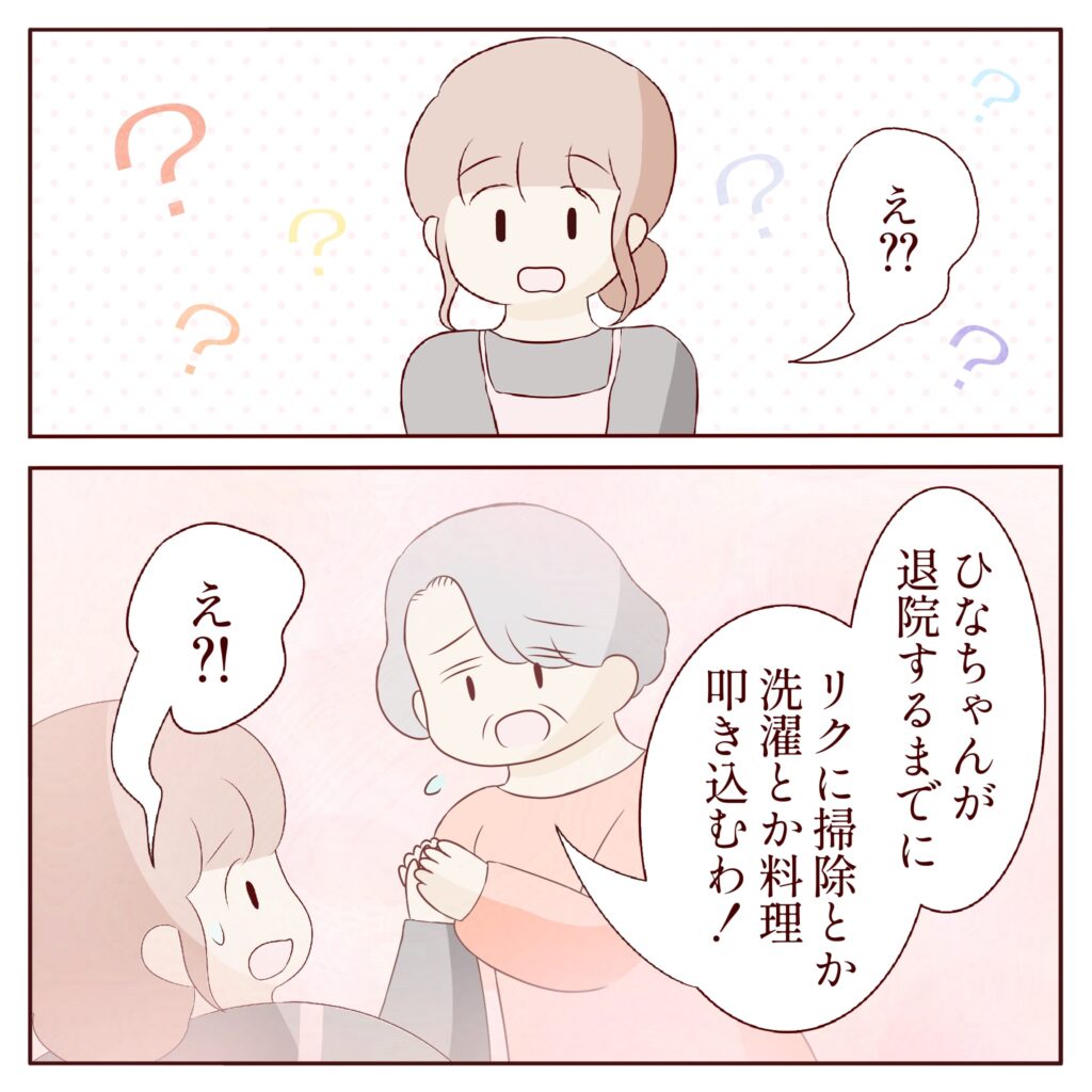 ヒナさんは何のことか分からず「え?」と聞き返します。すると義祖母は、困惑するヒナさんの手を取って「ヒナちゃんが退院するまでに、リクに掃除とか洗濯とか料理、叩き込むわ!」と言いました。