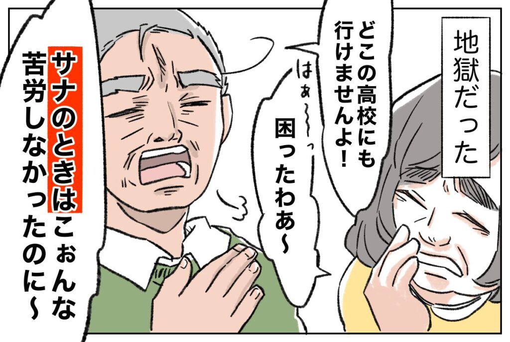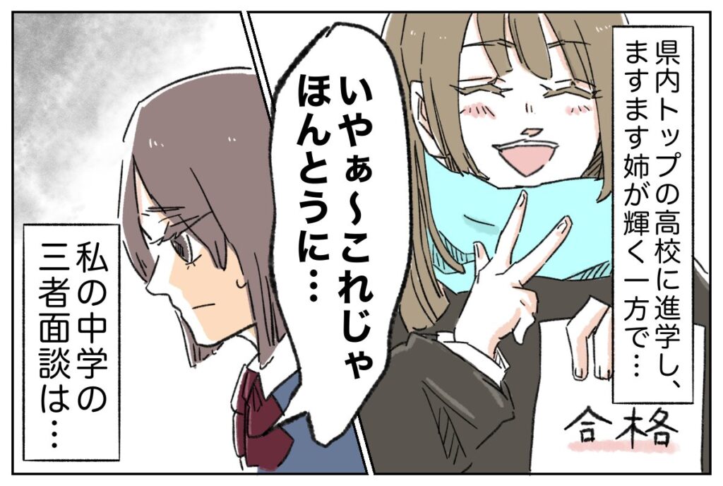 そして迎えた三者面談の日。一言で言えば、まさに地獄でした。「これじゃ本当に、どこの高校にも行けませんよ!」「困ったわ~サナのときはこんな苦労しなかったのに~」姉を知る先生と、私を出来の悪い妹だと思っている母。2人の言葉に挟まれ、心がすり減っていくのを感じました。