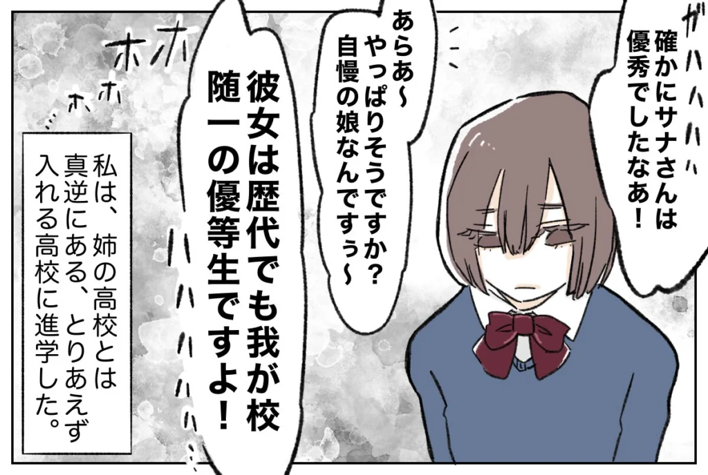 「確かにサナさんは優秀でしたな!歴代でも我が校随一の優等生ですよ」「あら~やっぱりそうですか?自慢の娘なんです」私の進路を決めるはずの面談なのに、話題は姉のことばかり。感情を押し殺しながら、ただ耐えるしかありませんでした。その後、私は姉の高校とは正反対の『とりあえず入れる高校』へ進学することになりました。