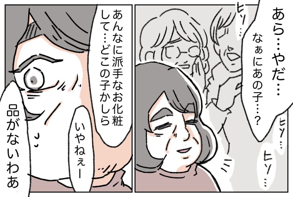 そんなとき、何かに気づいたご近所さんが、「あら、やだ・・・なぁにあの子?」「あんなに派手なお化粧して、どこの子かしら」と、ひそひそ話を始めました。母はご近所さんたちの視線の先へ目を向けると、冷や汗をかきながら、はっとした表情を浮かべます。
