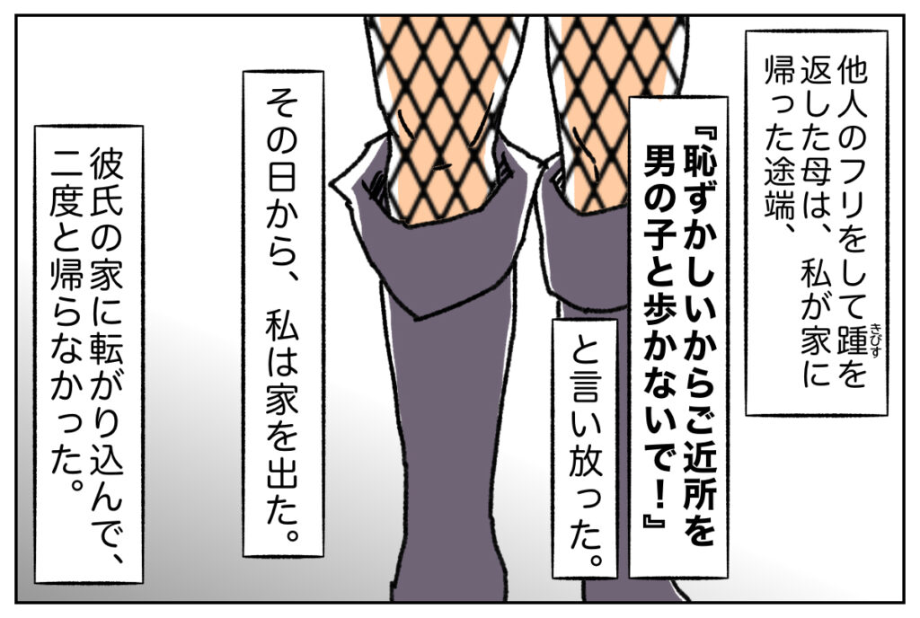 母は私と目が合うと、さっと顔をそらし、他人のフリをしてその場を離れました。家に帰るなり、「恥ずかしいからご近所を男の子と歩かないで!」と叱られたのが煩わしくて、私はその日から家を出て、彼氏の家に転がり込みました。