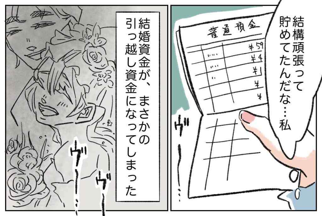 「結構頑張って貯めてたんだな・・私」そう思いつつ、「結婚資金が、まさかの引っ越し資金になってしまった」と、思い描いていた未来とは違う現実を叩きつけられました。