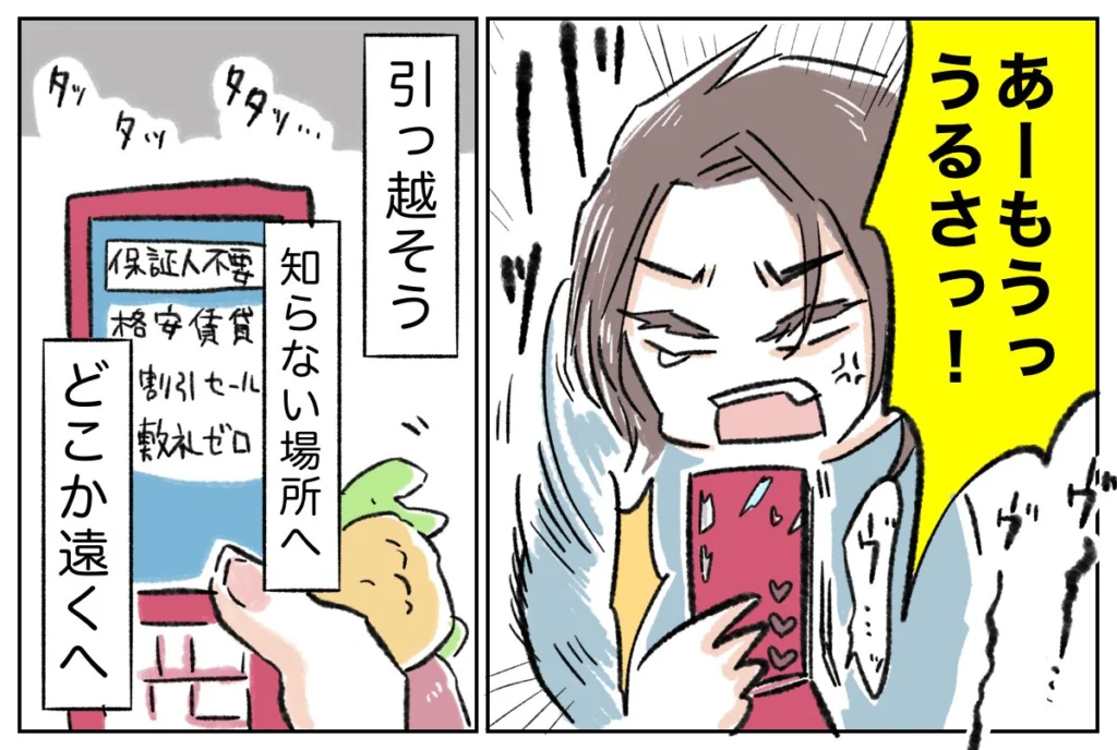 「あーもうっ!うるさっ!」そう言った後、電話を切り、すぐさま検索を開始。「保証人不要 格安賃貸 敷礼ゼロ」とキーワードを打ち込みながら、「引っ越そう。知らない場所へ。どこか遠くへ」と心の中で呟きました。