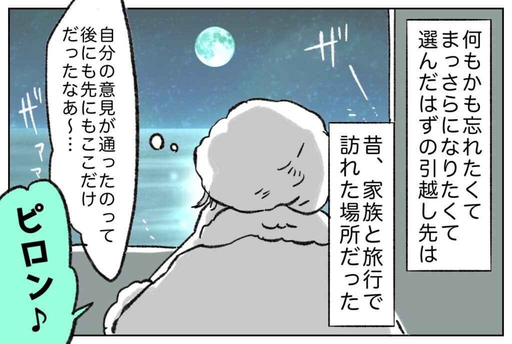 何もかも忘れたくて、まっさらになりたくて選んだはずの引っ越し先は、昔、家族と旅行で訪れた場所だったのでした。「自分の意見が通ったのって、後にも先にもここだけだったなあ~・・」そんな風に思っていると、ピロンとスマホが鳴りました。