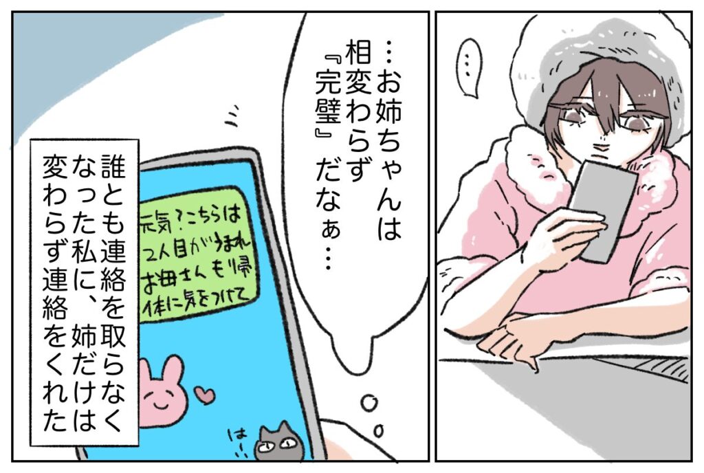 「・・お姉ちゃんは相変わらず『完璧』だなぁ・・」と呟きながら姉から届いたメッセージを見つめる私。誰とも連絡を取らなくなった私に、姉だけは変わらず連絡をくれたのでした。