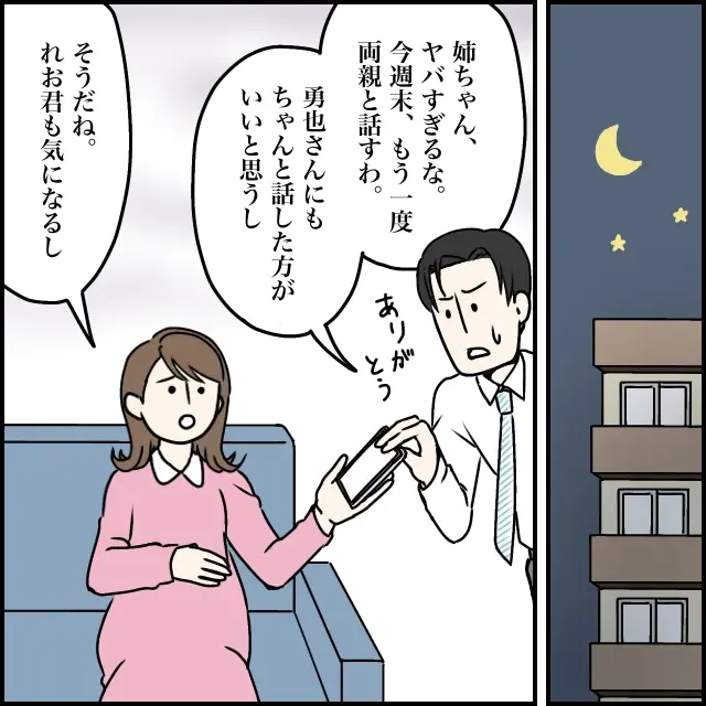 その夜、帰宅した太一に改めて玲美さんから届いたメッセージを見せると「姉ちゃん、ヤバすぎるな。今週末、もう一度両親と話すわ。勇也さんにもちゃんと話した方がいいと思うし」と神妙な顔で太一が言ったので、私も「そうだね。れお君も気になるし」と太一の意見に賛成しました。