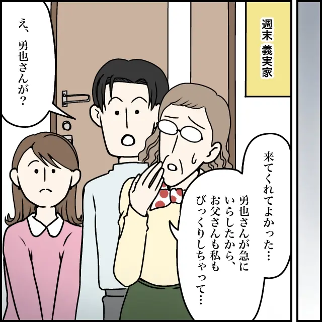 週末、太一と一緒に義実家に行くと「来てくれてよかった・・。勇也さんが急にいらしたから、お父さんも私もびっくりしちゃって・・」と困惑気味に義母が言いました。そういえば、義両親は玲美さんがいなくなったことを勇也さんに伝えるかどうか迷っていると太一が言っていました。