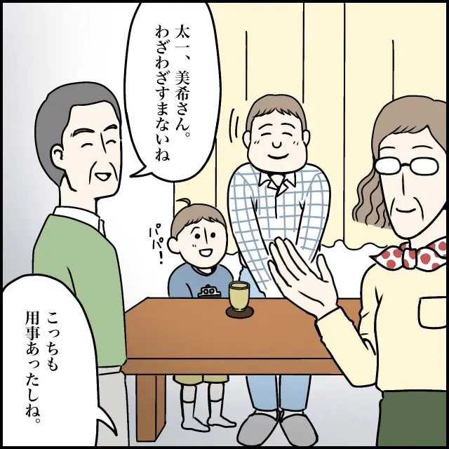 リビングに入ると、優しい笑顔でぺこりと頭を下げる勇也さんと、久しぶりパパに会えて嬉しそうなれおくんがいました。「太一、美希さん。わざわざすまないね」と義父も笑顔で迎えてくれました。和やかな雰囲気ですが、これからみんなで話し合う内容を思うとなんとも言えない気持ちです。