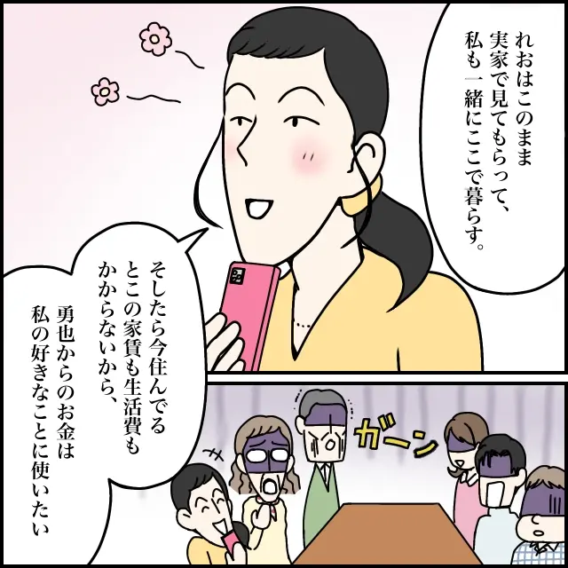 「れおはこのまま実家で見てもらって、私も一緒にここで暮らす、そしたら今住んでるとこの家賃も生活費もかからないから、勇也からのお金は私の好きなことに使いたい」頬をほんのりとピンク色に染め、呑気にそう語る玲美さん。あまりにも自分本位なその計画に、その場にいた全員が顔色を失います。