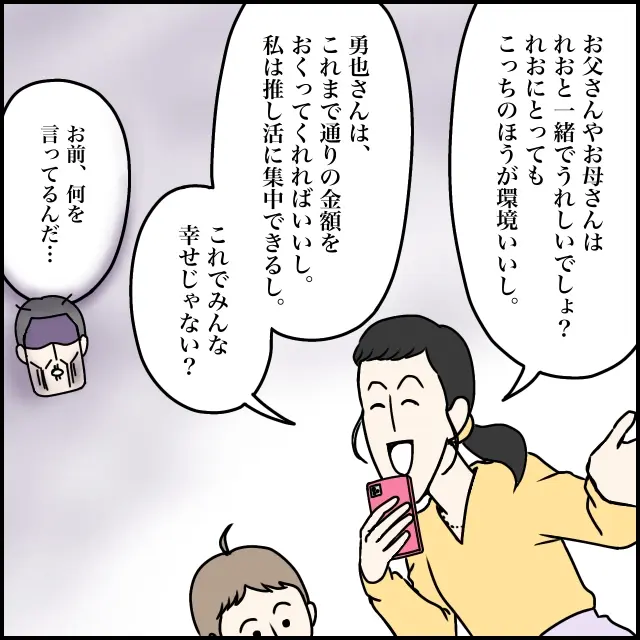 「お父さんやお母さんはれおと一緒でうれしいでしょ?れおにとってもこっちのほうが環境いいし、勇也さんはこれまで通りの金額を送ってくれればいいし、私は推し活に集中できるし、これでみんな幸せじゃない?」満面の笑みでそう話す玲美さん。その言葉を聞いた義父は、「お前、何を言ってるんだ・・・」と呆気にとられました。