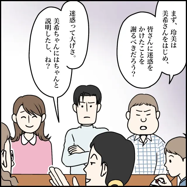 すると勇也さんが、「まず、玲美は美希さんをはじめ、皆さんに迷惑をかけたことを謝るべきだろう?」と玲美さんを鋭い視線でにらみながら言いました。しかし玲美さんは、「迷惑って大げさ、美希ちゃんにはちゃんと説明したし、ね?」と大げさだと言わんばかりに鼻で笑ったのです。