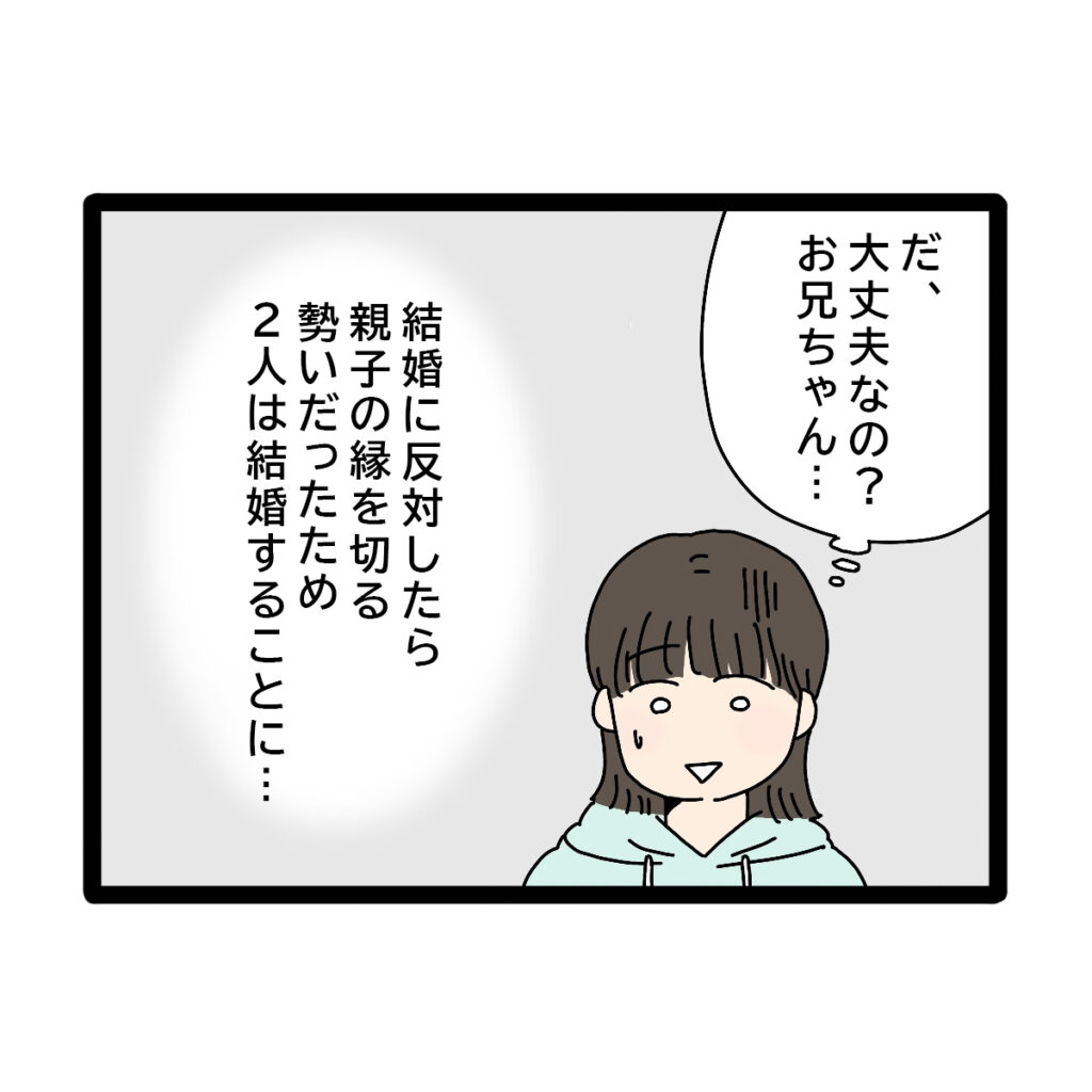 兄は、結婚に反対したら親子の縁を切る勢いだったこともあり、2人は結婚することになったのでした。
