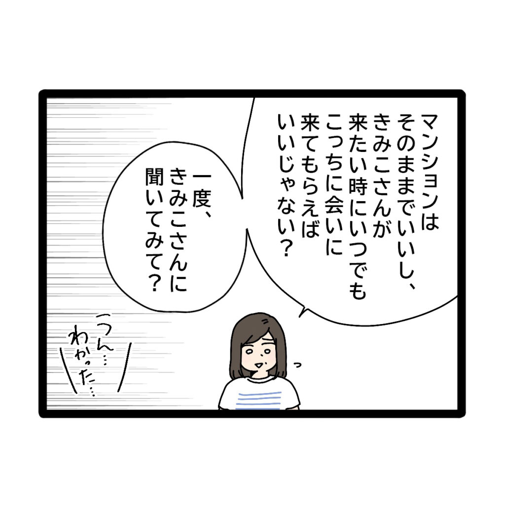 母は「マンションはそのままでいいし、きみこさんが来たい時にいつでもこっちに会いに来てもらえばいいじゃない?一度きみこさんに聞いてみて?」と伝えました。