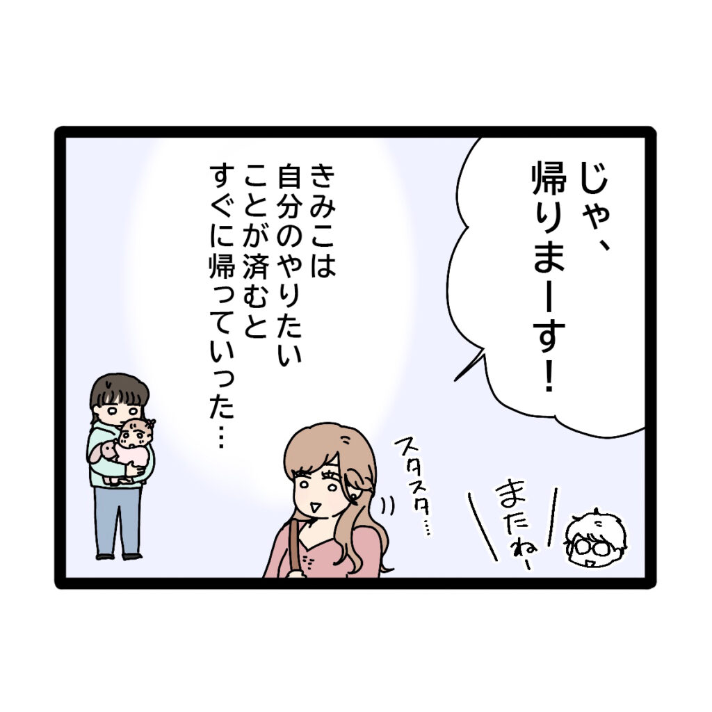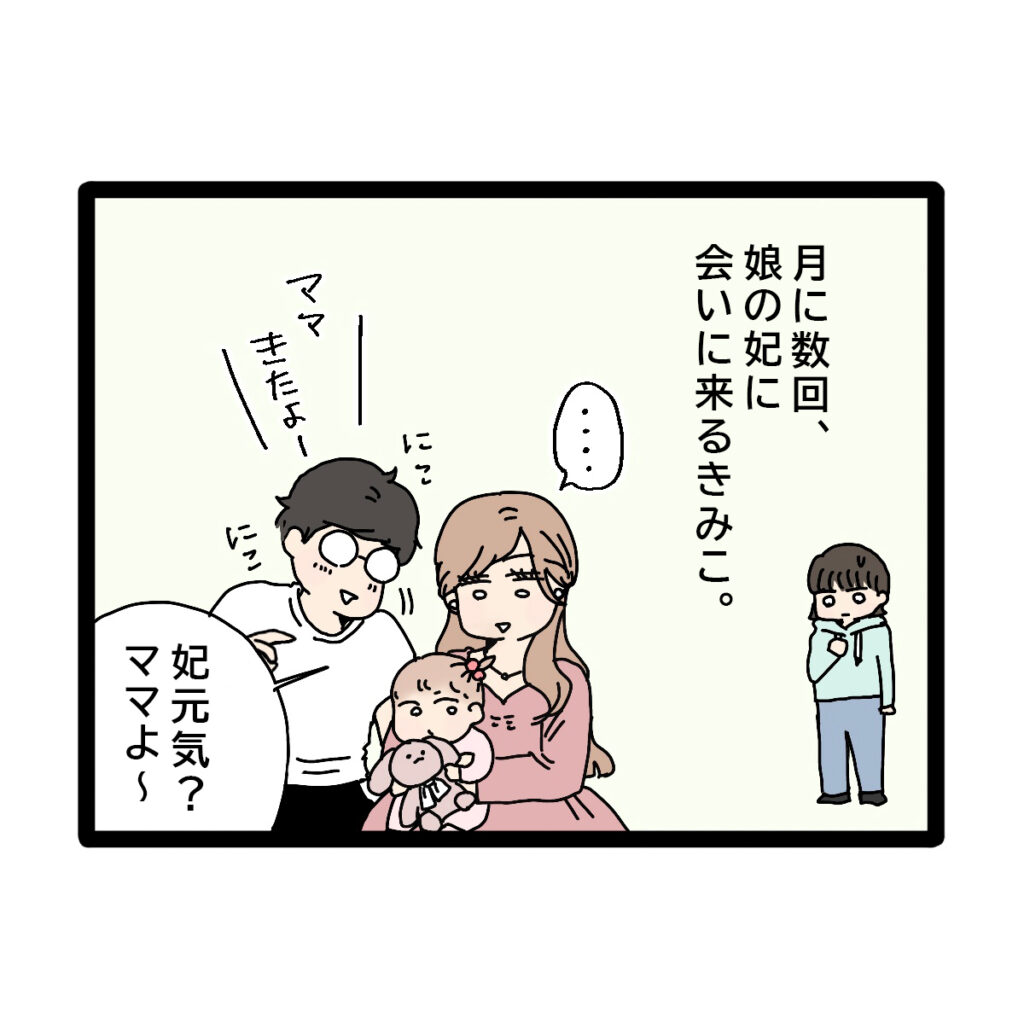 兄ときみこの別居生活が始まり、月に数回きみこが妃に会いに来るようになりました。「妃元気?ママよ~」と言うきみこに妃は無反応。兄は「ママきたよー」と家族が揃ってにこにこでとっても嬉しそうでした。