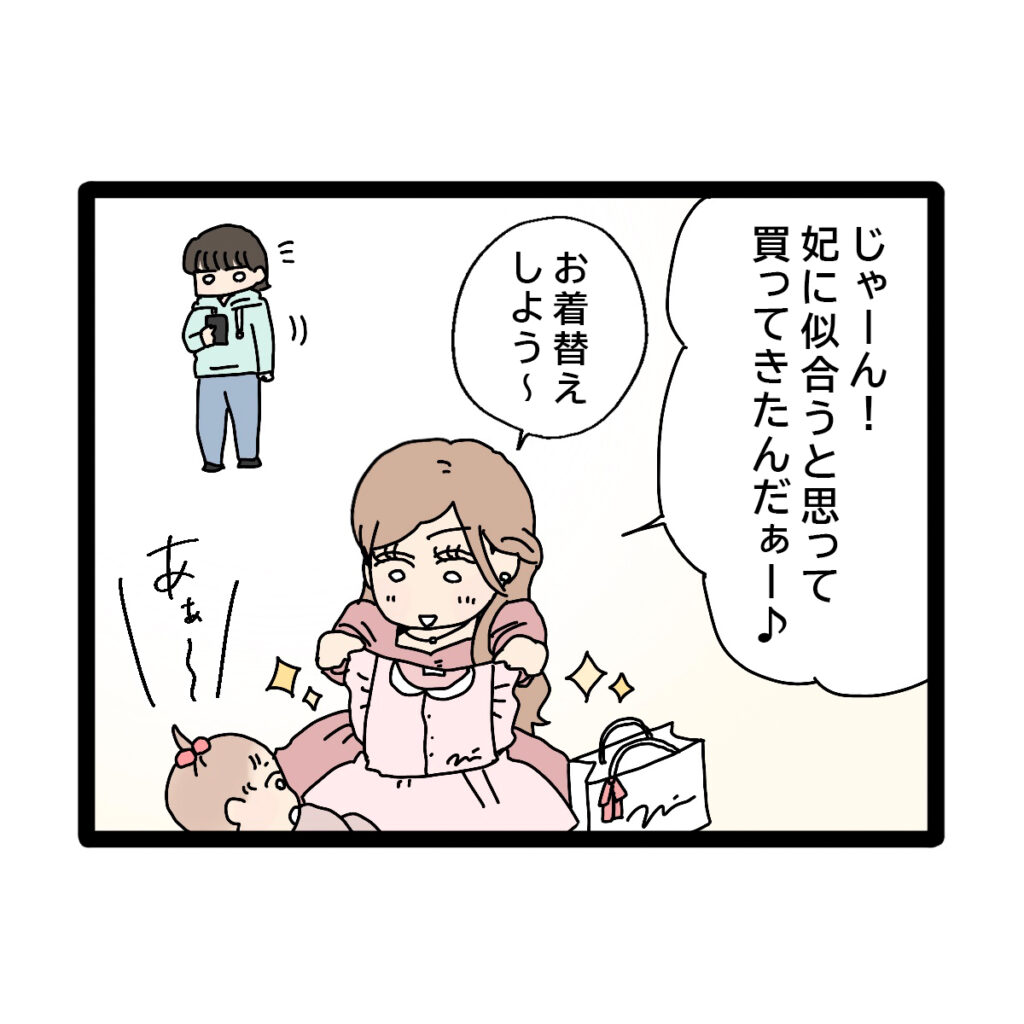 きみこは持ってきた紙袋を開け始めて「じゃーん!妃に似合うと思って買ってきたんだぁー!お着替えしよう~」と高そうなベビー服を妃に着させ始めました。