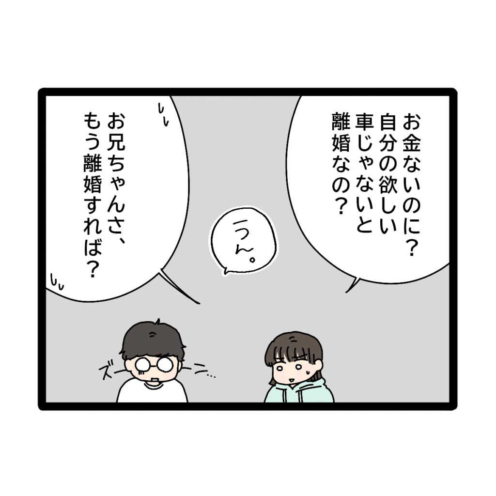 その言葉を聞いて、「お金ないのに?自分の欲しい車じゃないと離婚なの?」とたずねると、「うん」と頷く兄。呆れた私が「お兄ちゃんさ、もう離婚すれば?」と言うと、