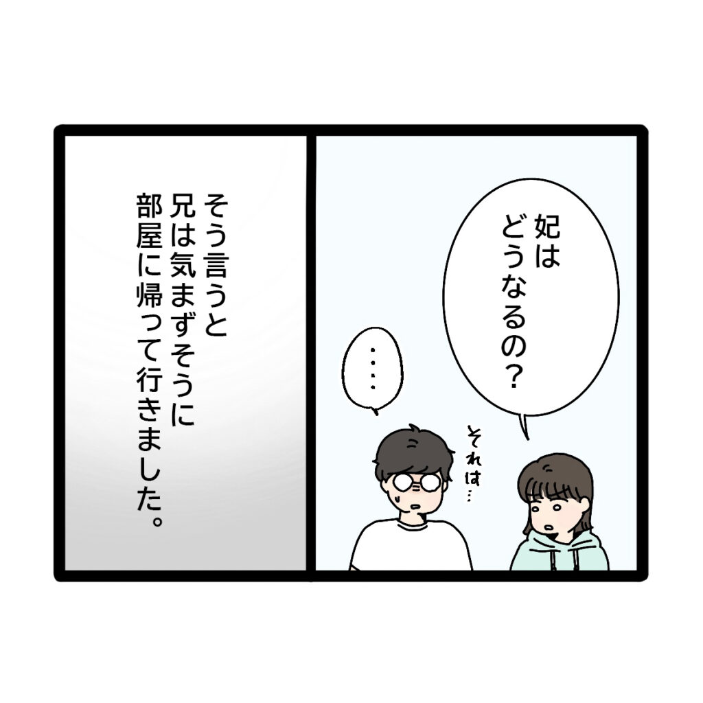 「妃はどうなるの?」とたずねると「・・それは」と言葉に詰まる兄。その後、兄は気まずそうに部屋に帰って行きました。