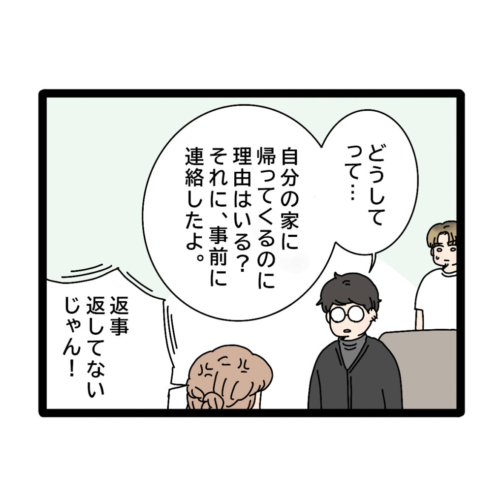 兄が「どうしてって・・・自分の家に帰ってくるのに理由はいる?それに、事前に連絡したよ。」と答えると「返事返してないじゃん!」と逆ギレするきみこ。
