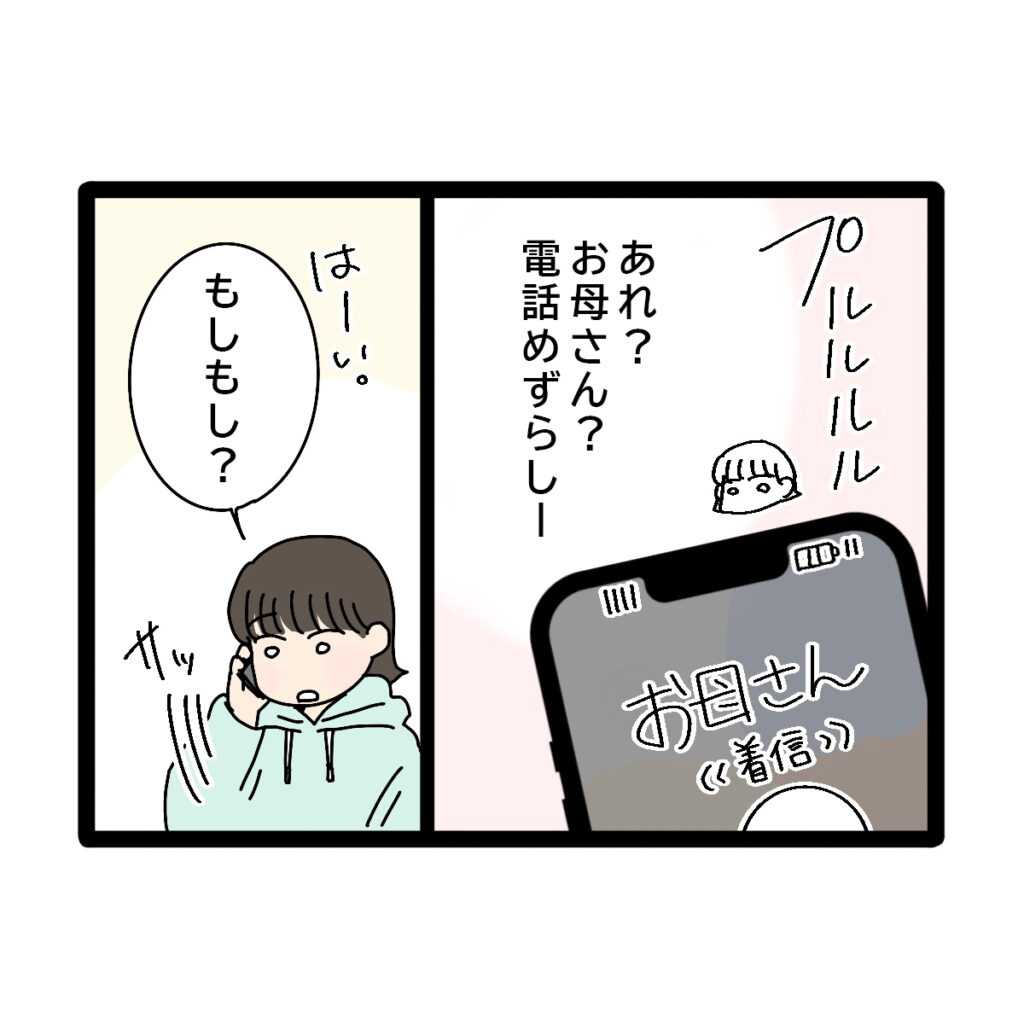 プルルルルとスマホが鳴り、「あれ?お母さん?電話めずらしー」そう思って、「はーい。もしもし?」と電話に出ると、