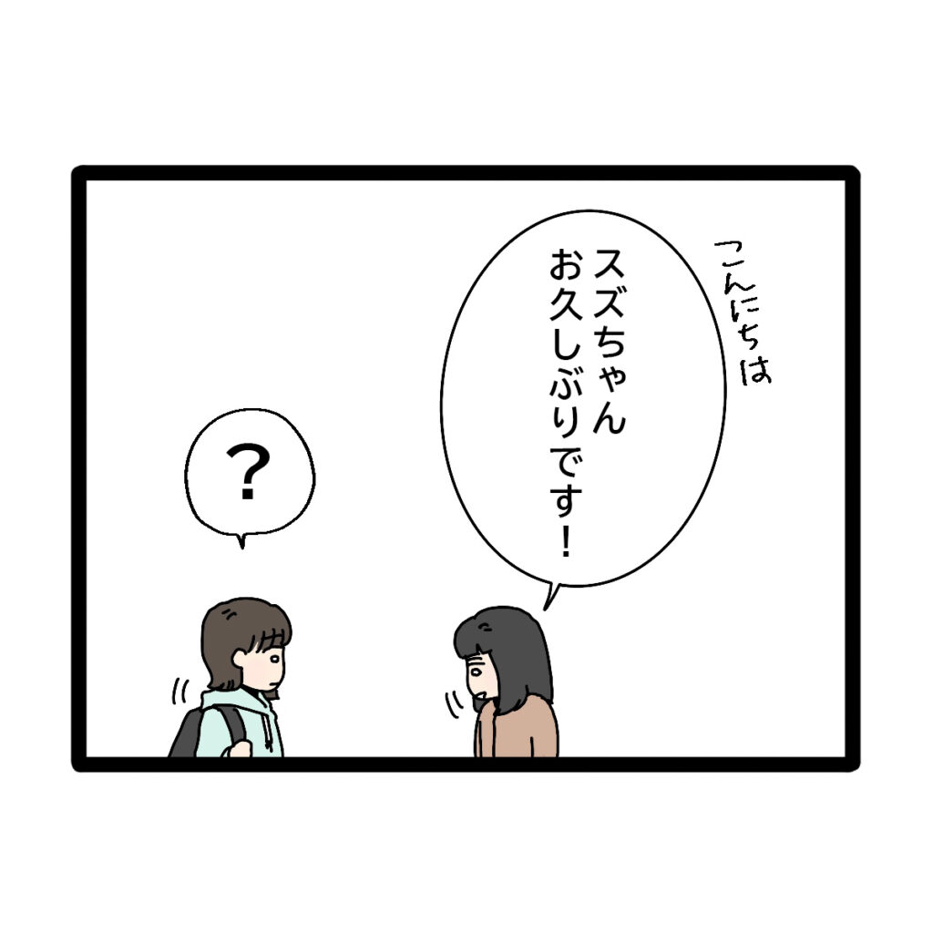 すると、その女性が近づいてきて「こんにちは。スズちゃんお久しぶりです」と言ったものの、「?」私の頭の中は「?」でいっぱいに!