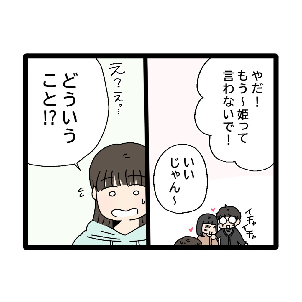 そして、「やだ!もう~。姫って言わないで!」きみこがそう言うと、「いいじゃん~」と兄が言い、二人でイチャイチャ。「え?えっ・・どういうこと!?」全く訳が分からずたずねると、ことの経緯を話してくれました。
