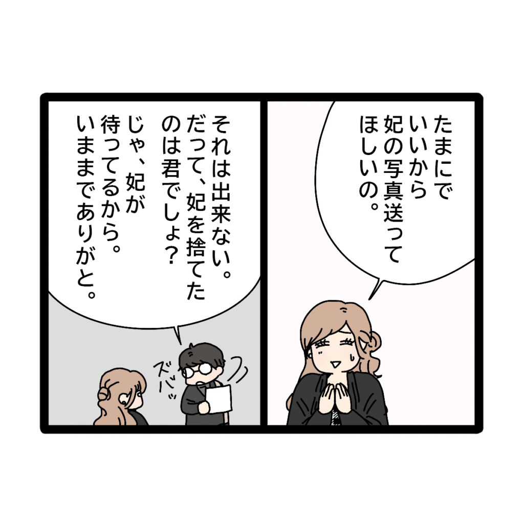 「たまにでいいから、妃の写真送ってほしいの」きみこがそうお願いすると、「それは出来ない。だって、妃を捨てたのは君でしょ?」そう言うと、「じゃ、妃が待ってるから。いままでありがと」と兄がキッパリと言いました。