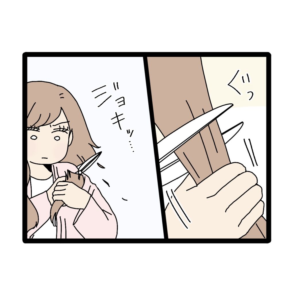 全てを失い自分の愚かさを深く悔やんだきみこは、おもむろにハサミを手に取ると自分の長い髪を掴み、躊躇なくジョキッと切り落としました。