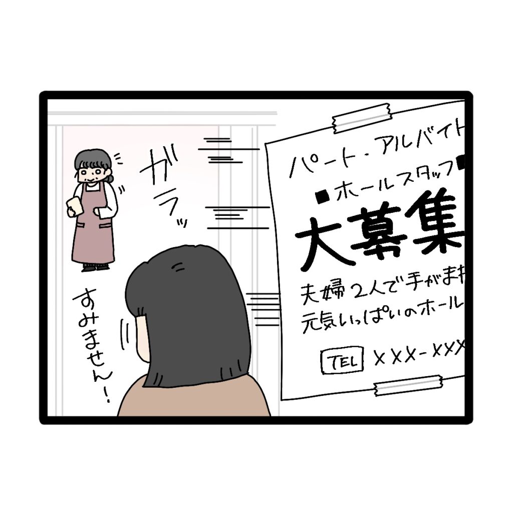 その後、きみこは明るかった髪色を暗く染め直しました。ホールスタッフを募集する洋食レストランの張り紙を見たきみこが「すみません!」とお店に入ると、高齢の女性が笑顔で出迎えてくれました。