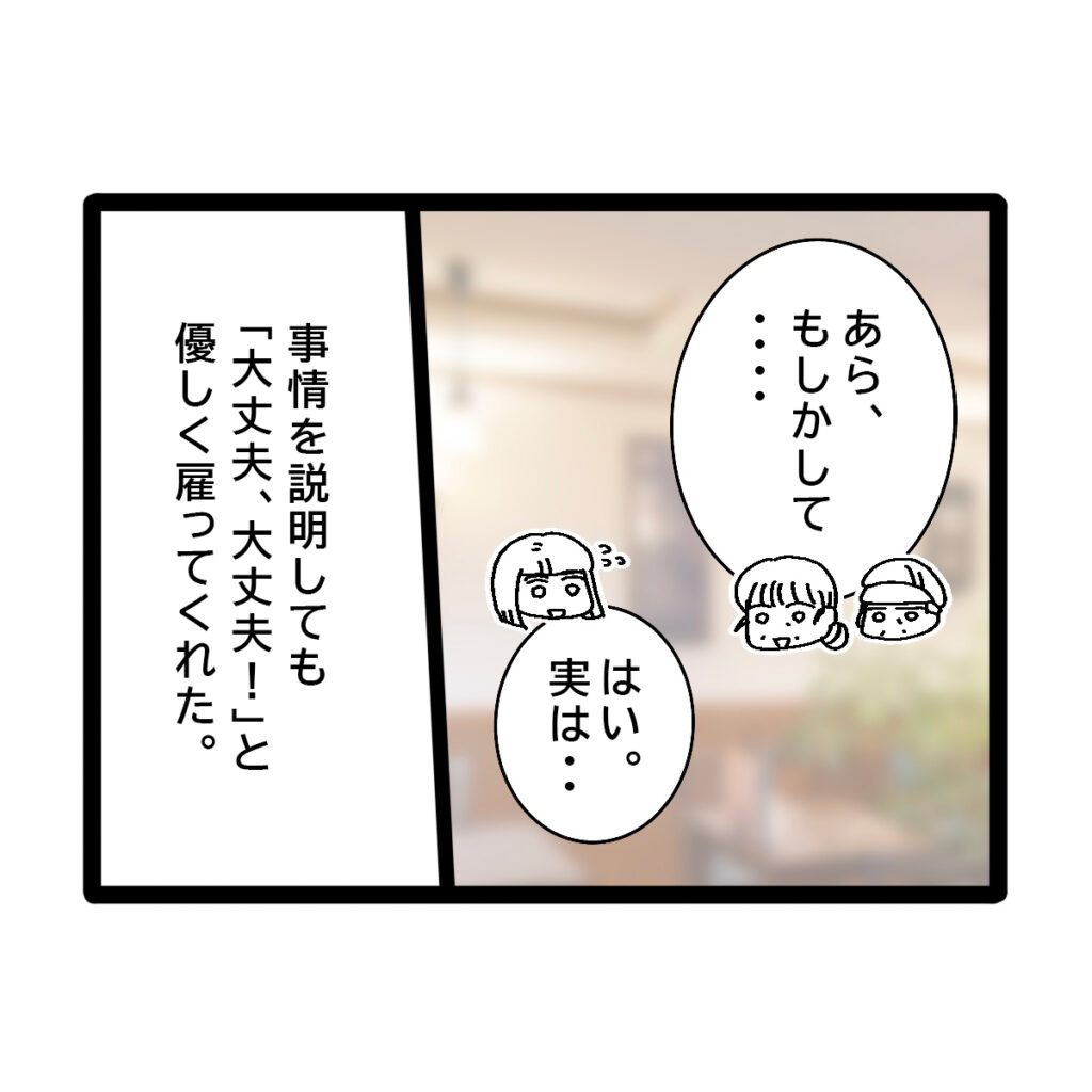 出迎えてくれたのは店長の妻、さやさんでした。2人はきみこのお腹を見て「あら、もしかして・・」と妊娠に気付き、きみこは事情を説明。断られるかと思ったものの、「大丈夫、大丈夫!」と優しく言ってくれきみこを雇ってくれました。