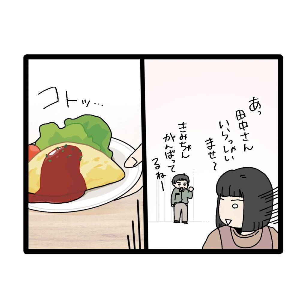 そして店長夫婦は、きみこが食費が大変だろうからとまかないまでつけてくれました。「きみちゃんどうぞ~。しっかり食べてね!」と、できたてのオムライスを出してもらったきみこは「店長、さやさん、ありがとうございます!」と2人に心から感謝しました。