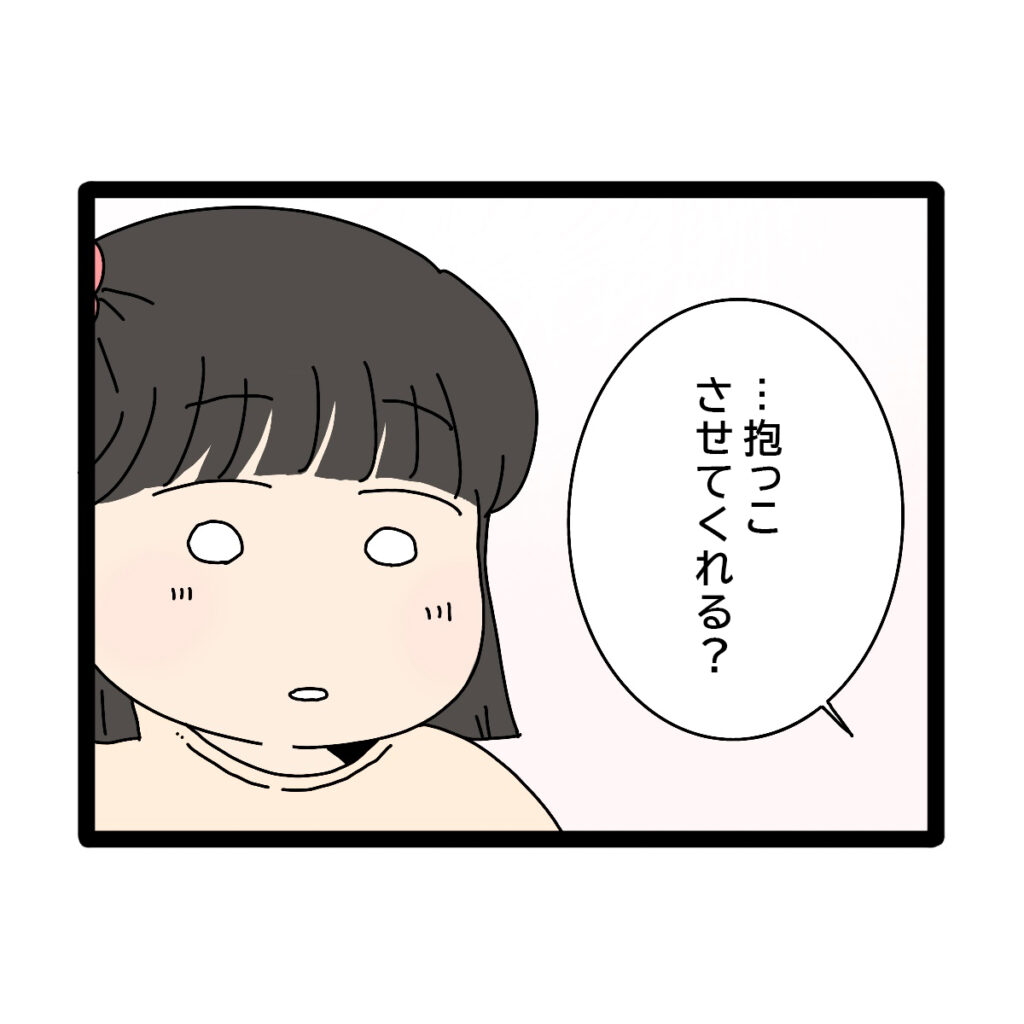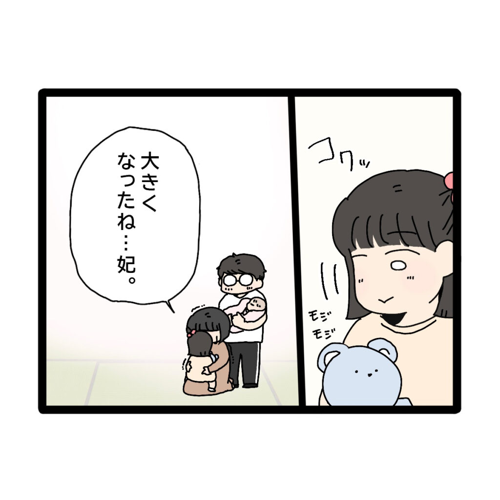 そして、恥ずかしそうにモジモジしながから妃はコクリと頷きました。久しぶりに妃を抱っこして「大きくなったね・・・妃」と涙が止まらないきみこ。