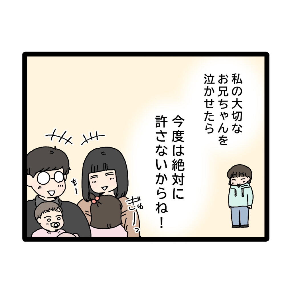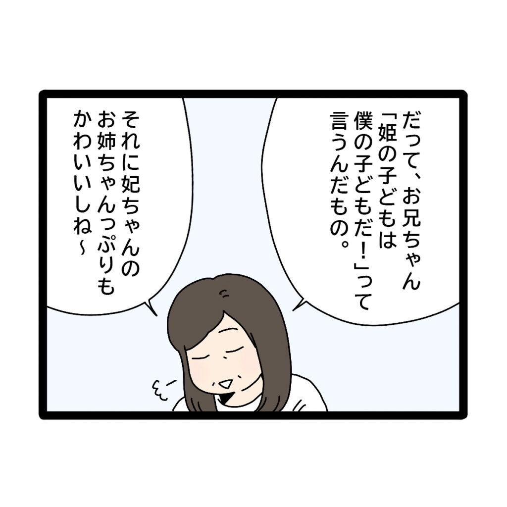 すると母は、「だって、お兄ちゃん『姫の子どもは僕の子どもだ!』って言うんだもの。それに妃ちゃんのお姉ちゃんっぷりもかわいいしね~」とヤレヤレといった様子でため息をつきました。