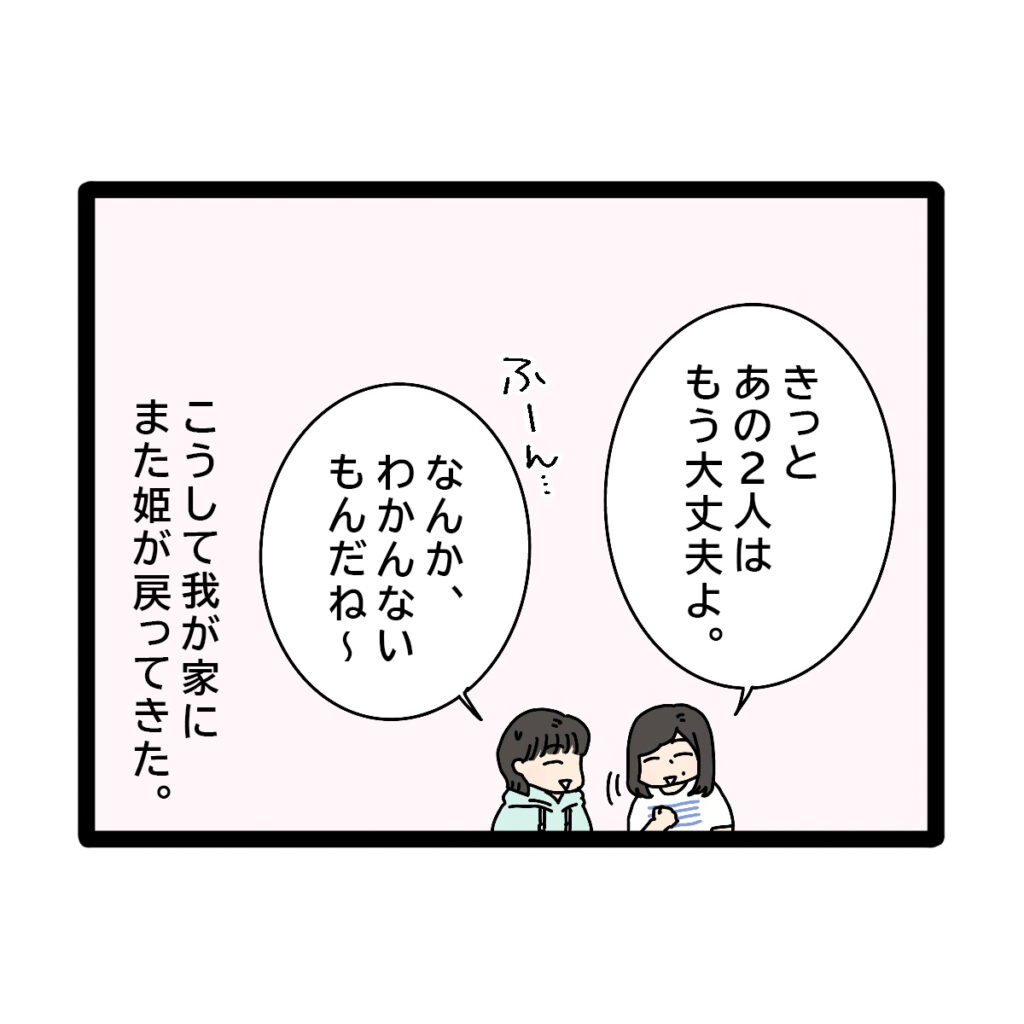 「きっとあの2人はもう大丈夫よ。」とニコッと笑う母に私は「ふーん・・・なんか、わかんないもんだね~」と答えました。こうして我が家にまた姫が戻ってきました。