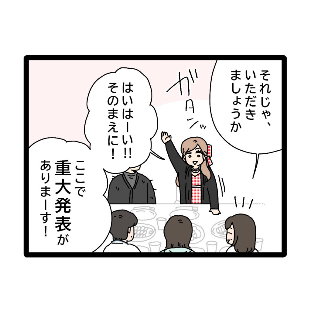 「な・ん・と!私たちに赤ちゃんができました~!わ~!!パチパチ」自分で言って自分で拍手しているきみこの言葉に、「えっ」と驚く両親と私。慌てて「おー。めでたいな」とお父さんが言うと、「おっ、おめでとう~」と言うお母さん。